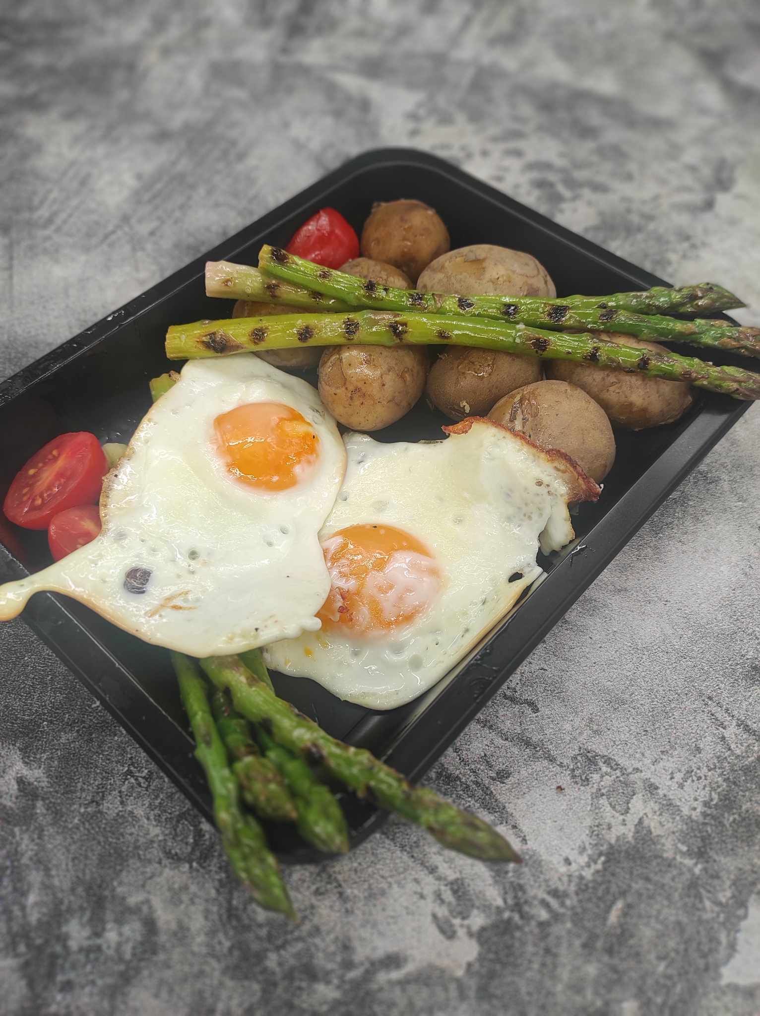 ziemniaki ; jaja ; szparagi ; pomidory cherry ; koper