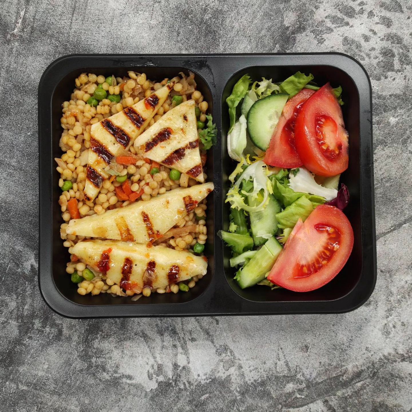 cukinia ; kasza kuskus ; włoszczyzna ; groszek zielony ; cebula ; marchew mini ; kalafior ; ser mozzarella ; czosnek ; koper ; sól ; pieprz