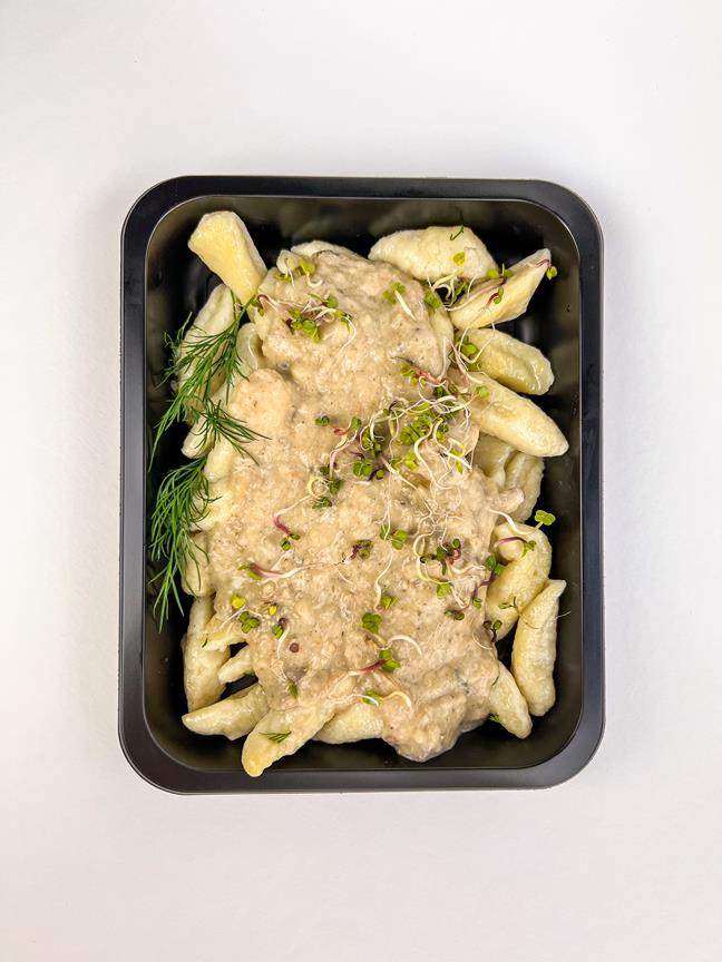 gnocchi, mleko, pieczarki, śmietana 30% tłuszczu, cebula biała, woda, koperek, sól, pieprz, czosnek, kiełki buraka