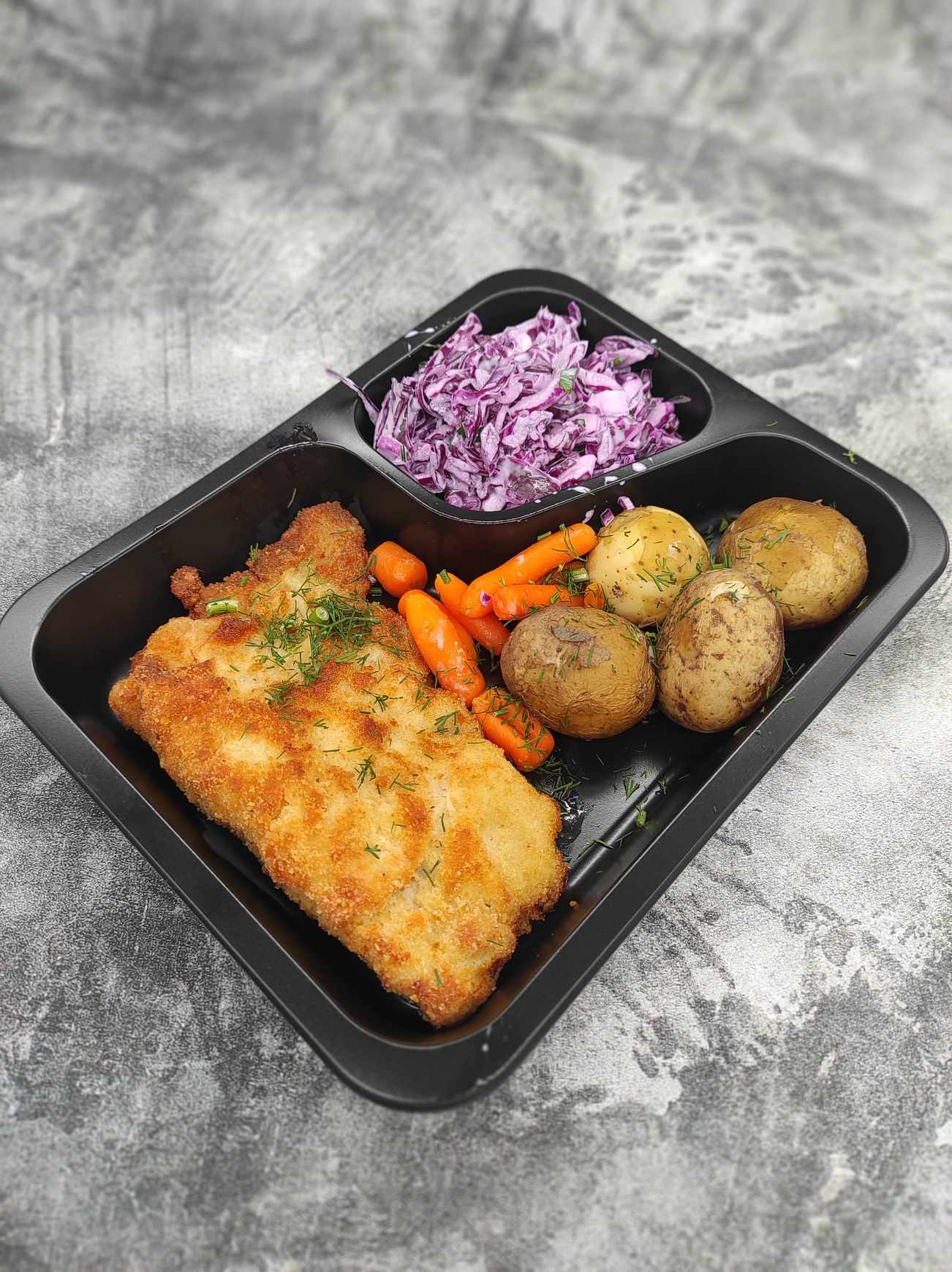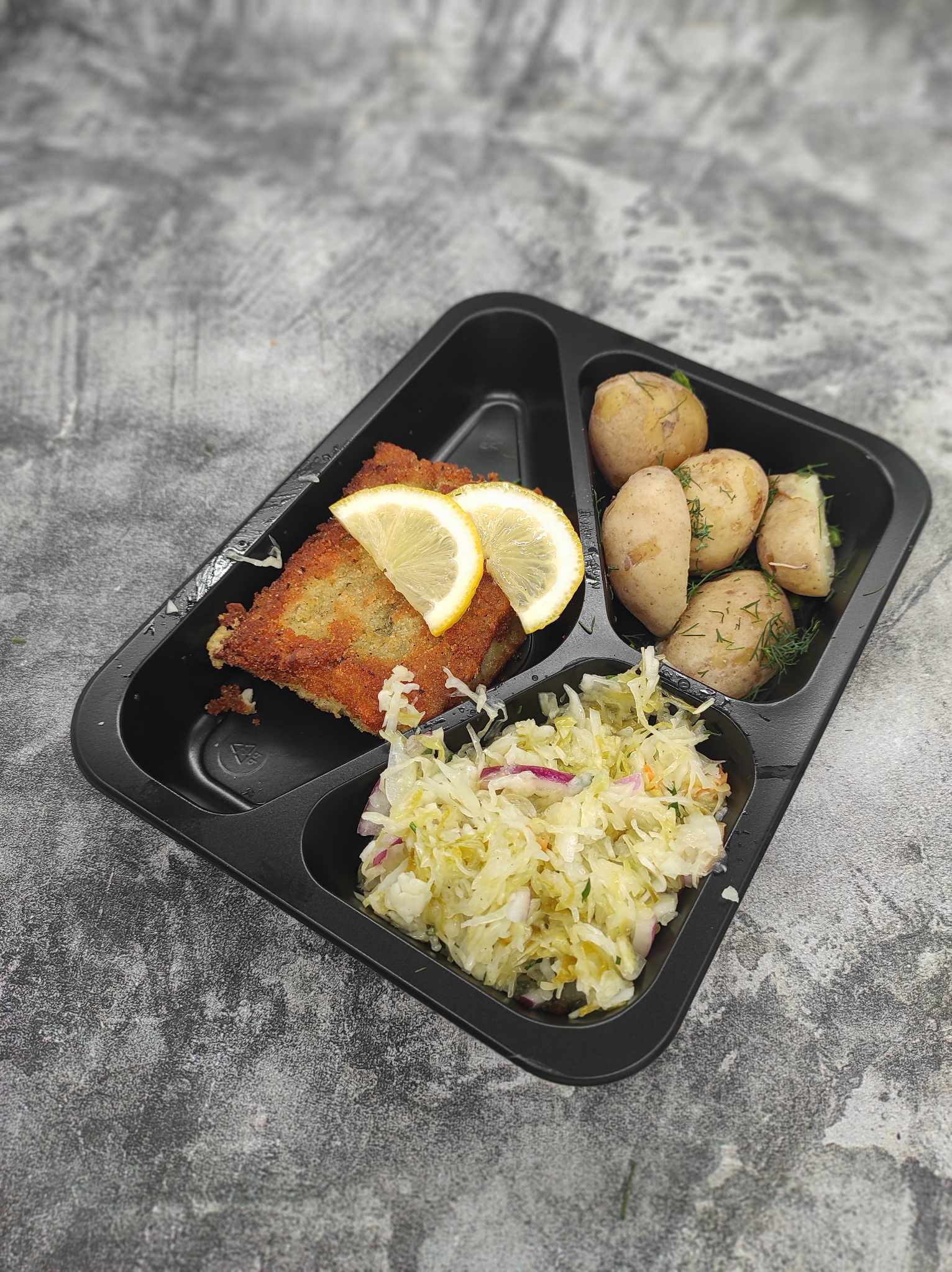Sznycel z piersi kurczaka, ziemniaki, surówka z kapusty pekińskiej