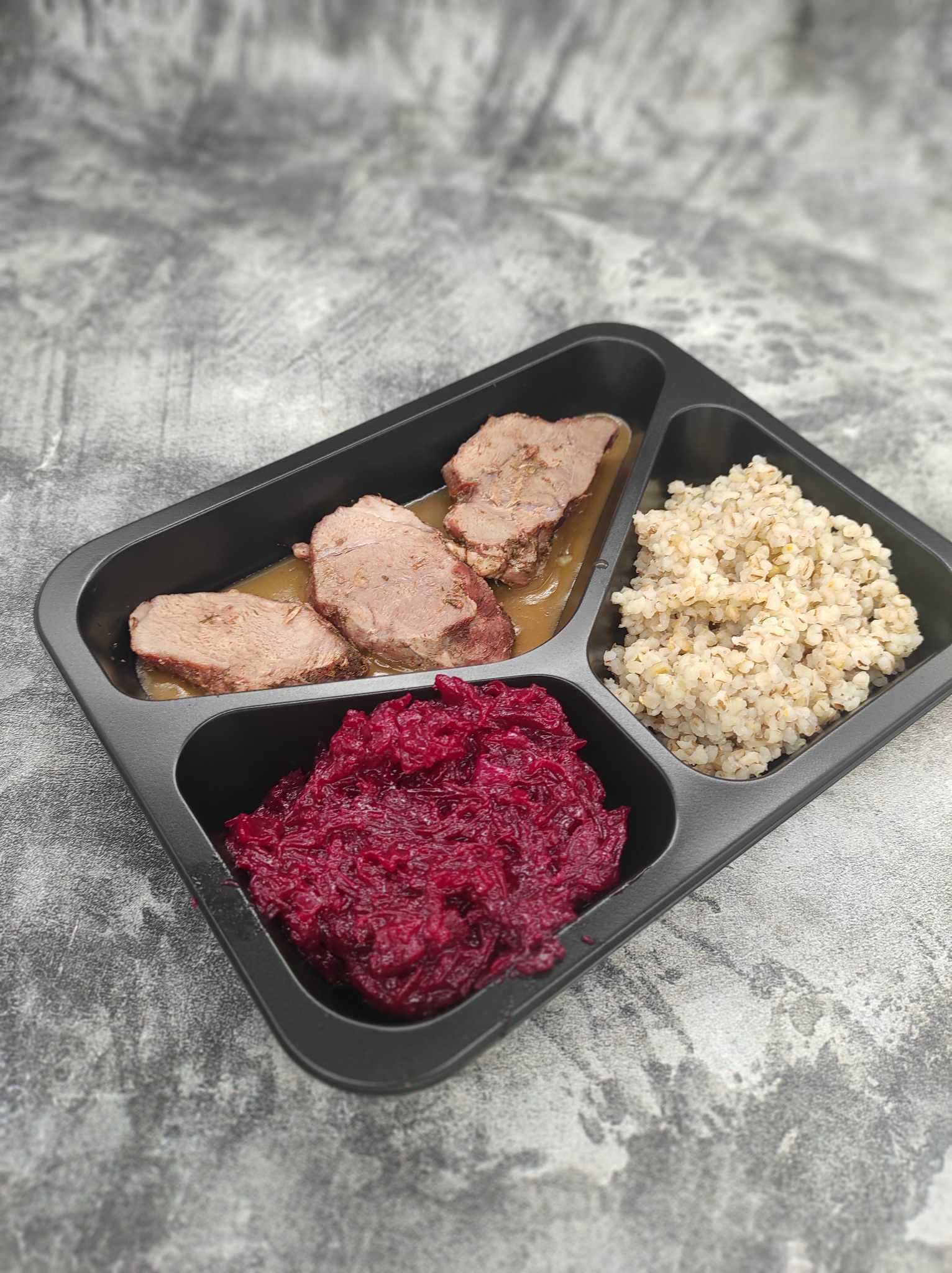 (Dieta) Bitki wieprzowe w sosie własnym, kasza jęczmienna, buraczki