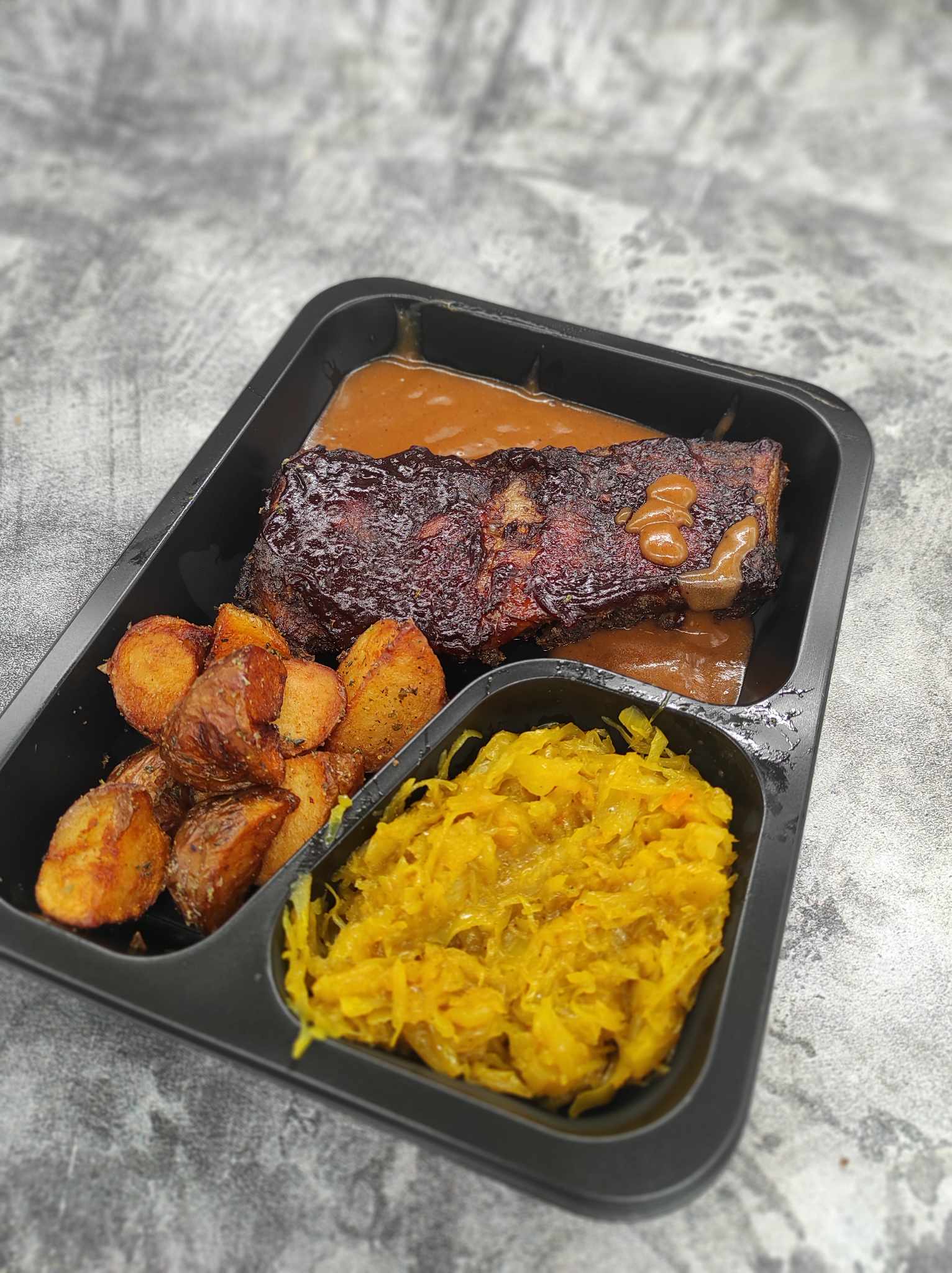 (Danie szefa kuchni) Żeberko wieprzowe w sosie BBQ, ziemniaki opiekane, kapusta curry