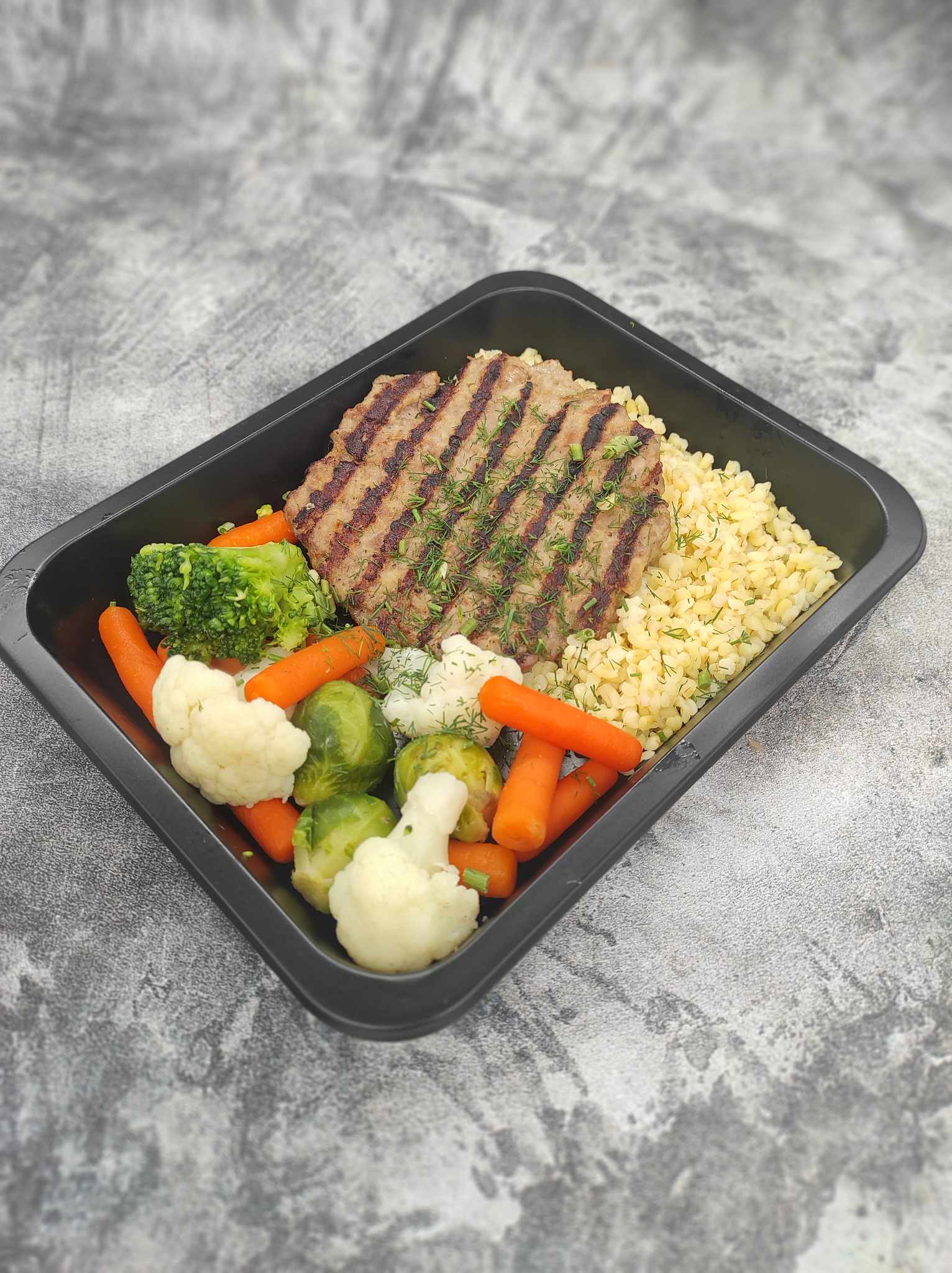 kasza bulgur ; polędwica wieprzowa ; włoszczyzna ; wywar mięsny ; cebula ; kalafior ; zielony groszek ; tymianek ; czosnek ; mąka pszenna ; pieprz ; sól