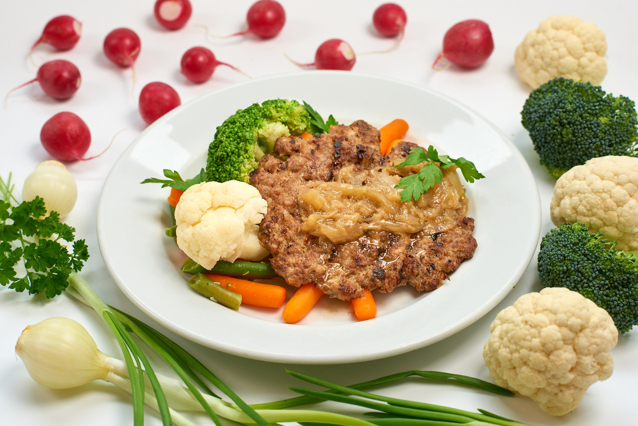 (Dieta) Bitki wieprzowe w sosie własnym, kasza jęczmienna, warzywa na parze