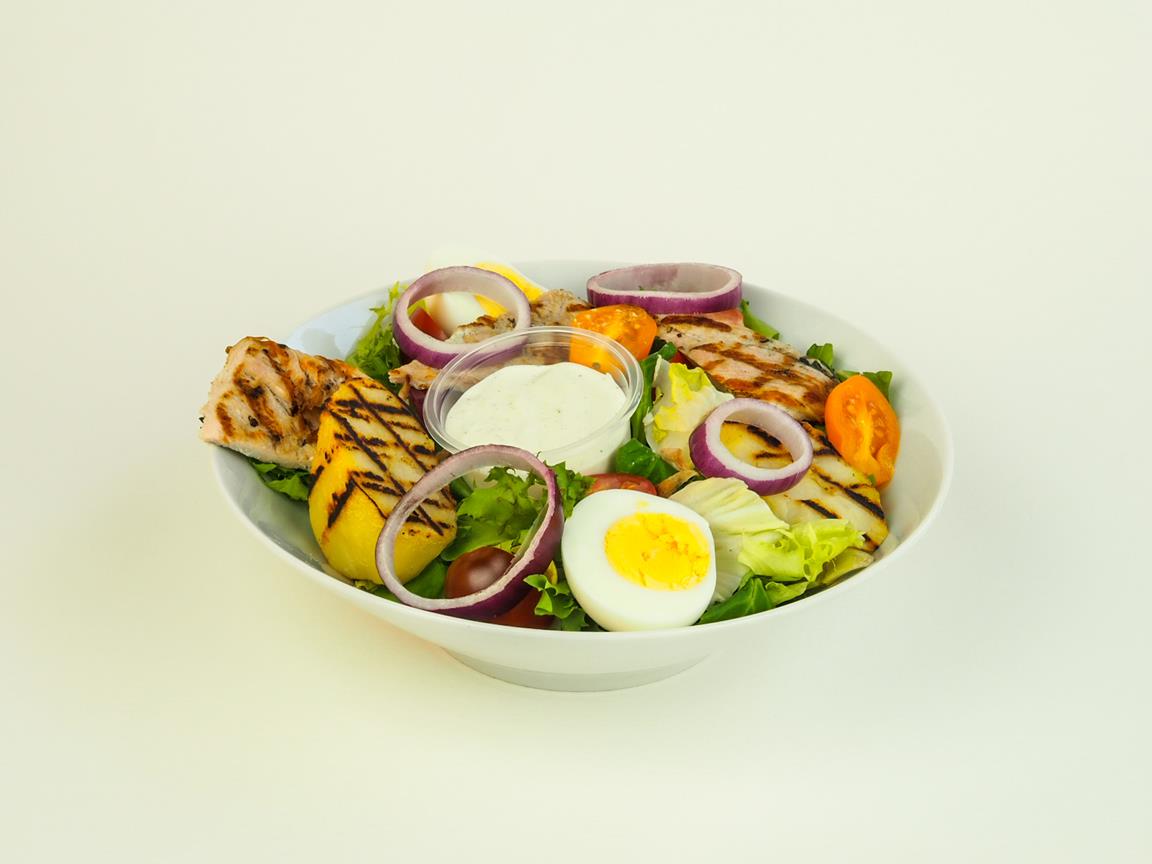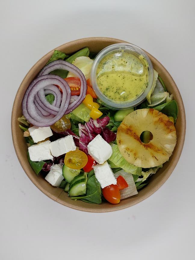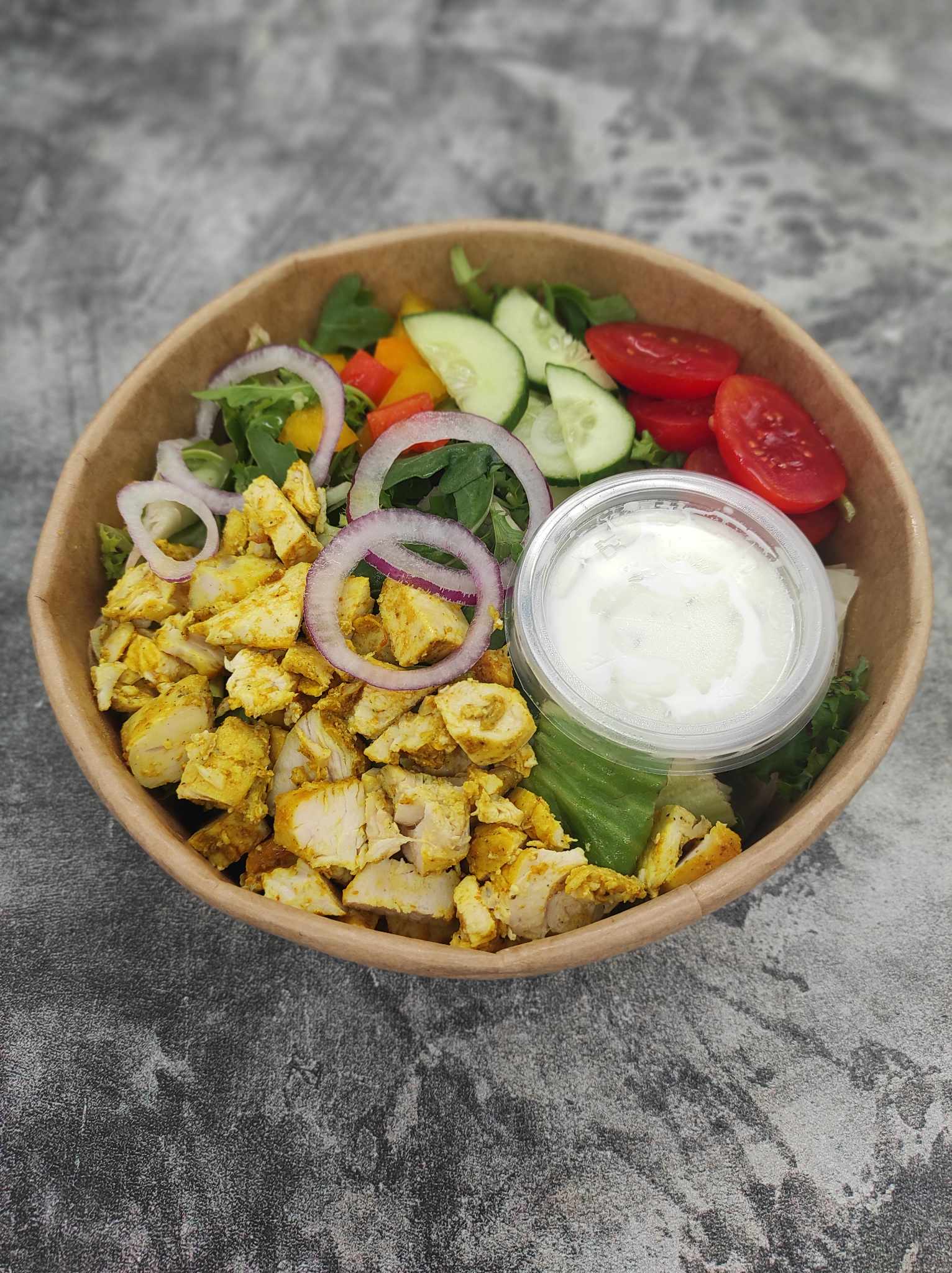 mix sałat ; filet z piersi z kurczaka ; ser lazur ; sałata lodowa ; papryka ; ogórek ; pomidorki cherry ; cebula ; szpinak ; olej