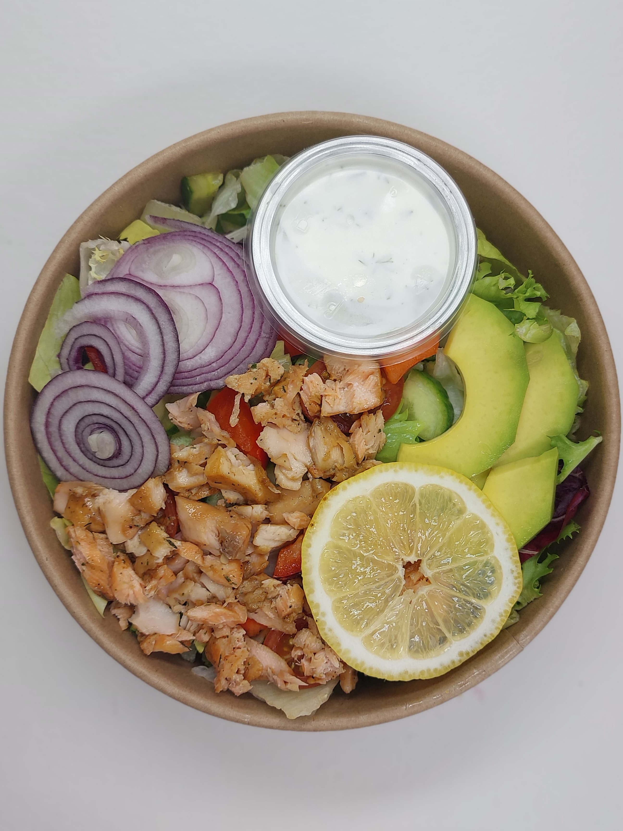 mix sałat ; łosoś ; ogórek zielony ; avokado ; papryka ; cebula ; pomidorki cherry , cytryna ; przyprawy