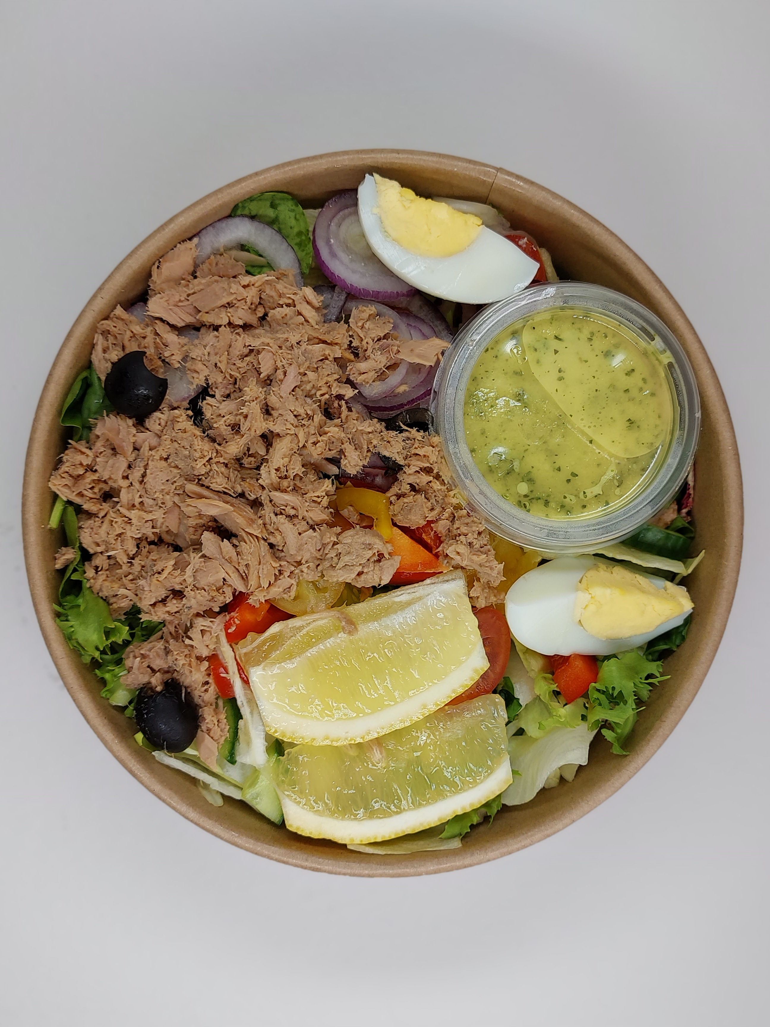mix sałat ; tuńczyk ; jaja ; papryka ; ogórek ; cebula ; oliwa z oliwek