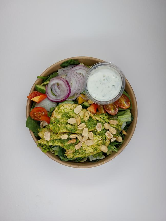 mix sałat ; filet z kurczaka ; zielone pesto ( nerkowiec, oliwa, parmezan, pietruszka , bazylia ) ; sos winegret ; ogórek zielony ; papryka ; cebula czerwona ; pomidor cherry , miód