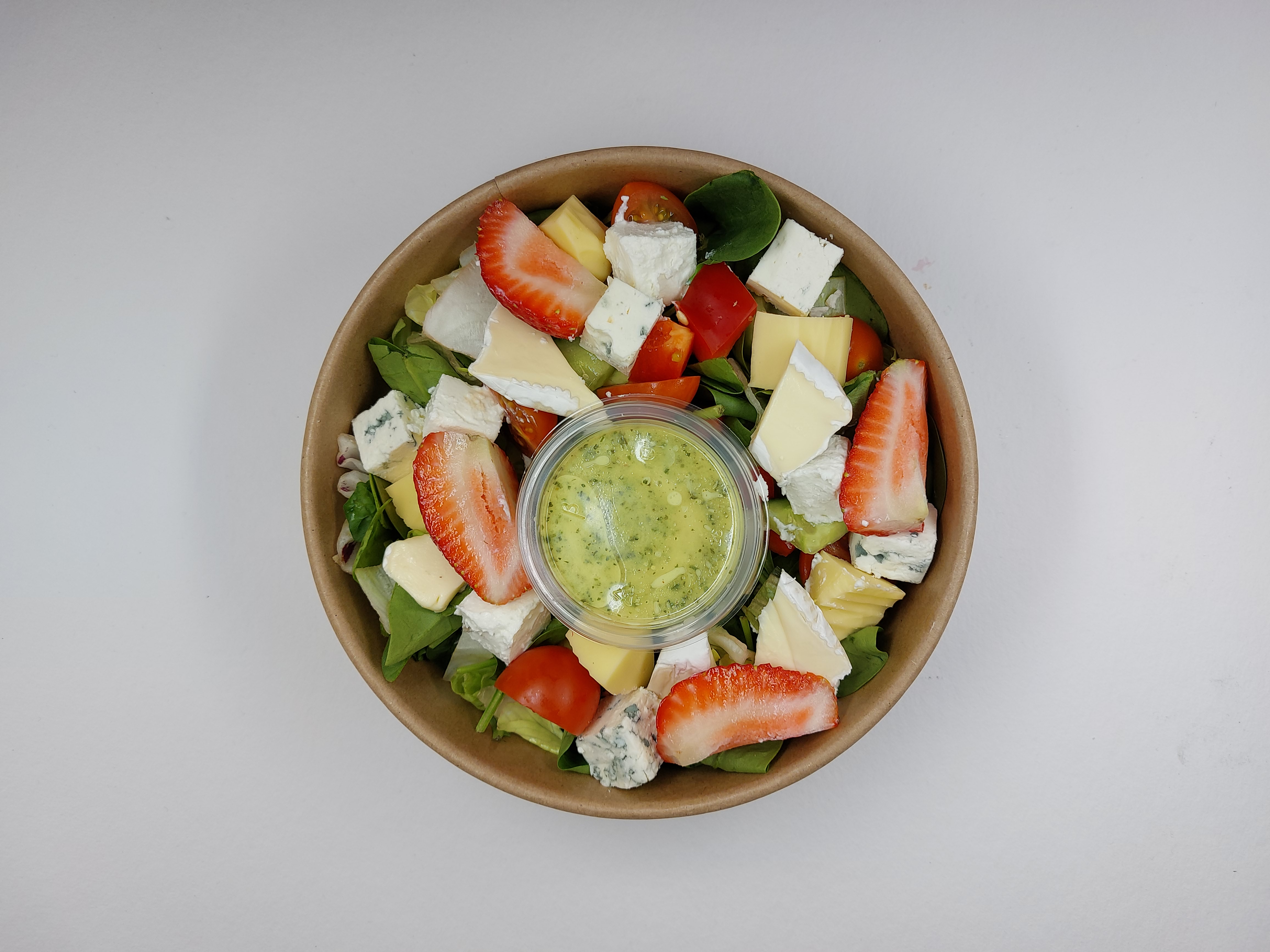 mix sałat ; ser pleśniowy ; truskawki ; ogórek ; pomidorki cherry ; papryka czerwona ; szpinak ; roszponka ; cebula ; sos winegret