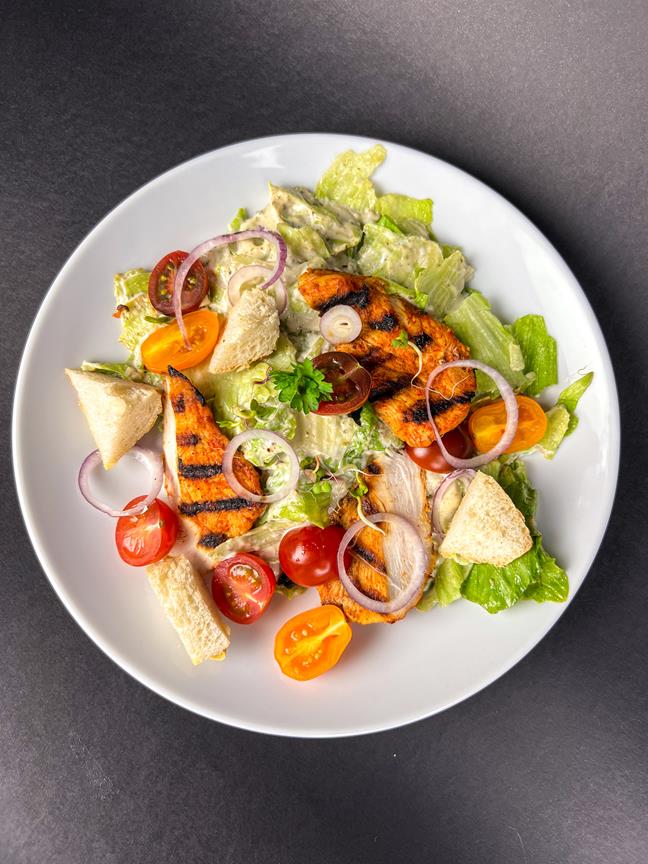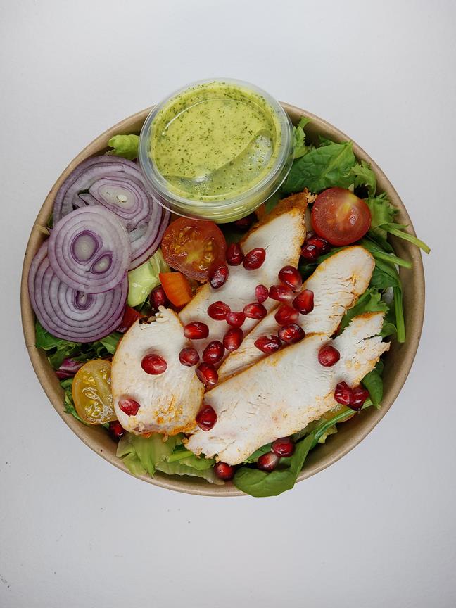 filet z piersi z kurczaka ; mix sałat ; papryka ; ogórek ; granat ; roszponka ; szpinak ; cebula ; sos winegret