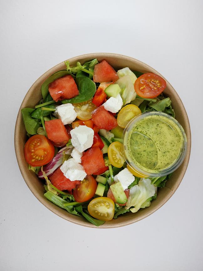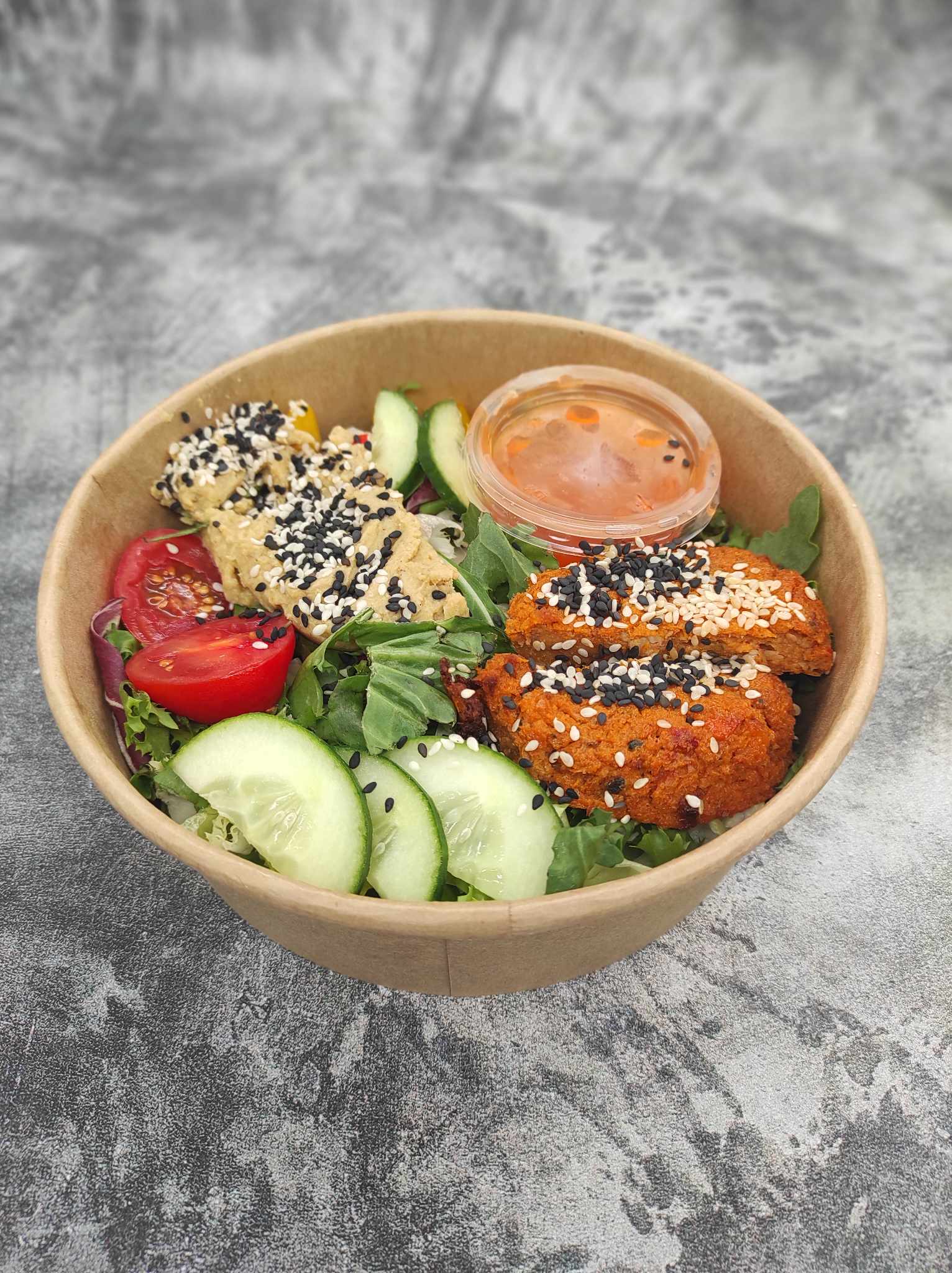 humus ; burak ; ser kozi ; mix sałat ; komosa ryżowa ; ogórek zielony ; papryka , pomidor cherry