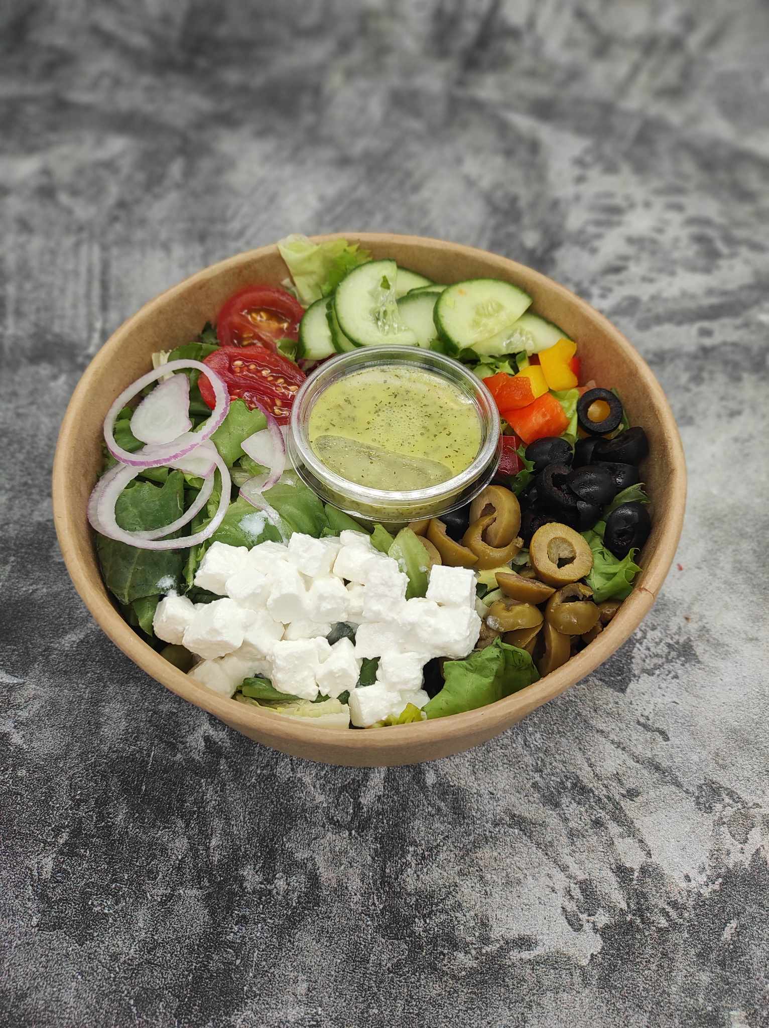 burak, mix sałat, ser kozi, sos winegret, ogórek, papryka, pomidor, cebula, przyprawy