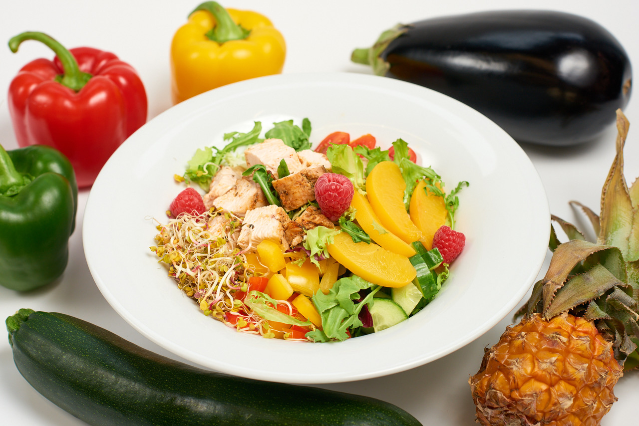 filet z piersi kurczaka ; mix sałat ; brzoskwinie ; ananas ; arbuz ; szpinak ; pomidorki cherry ; sos winegret